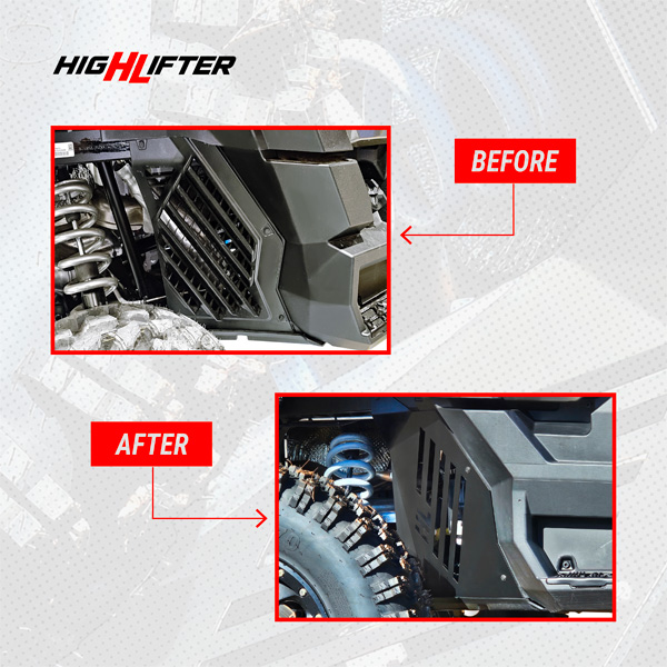 The High Lifter® Ranger 1500 Rear Inner Wheel Well Cover is a key component if you're looking to upgrade your vehicle to larger 35" tires. With this panel, you only need front forward arms and the High Lifter® Rear Inner Wheel Well Cover to make the upgrade. This makes it an easy and efficient solution for improving your ride's performance and clearance. The inner wheel well cover helps complete the fender area, ensuring that the larger tires fit properly while also protecting the vehicle's components from dirt and debris.