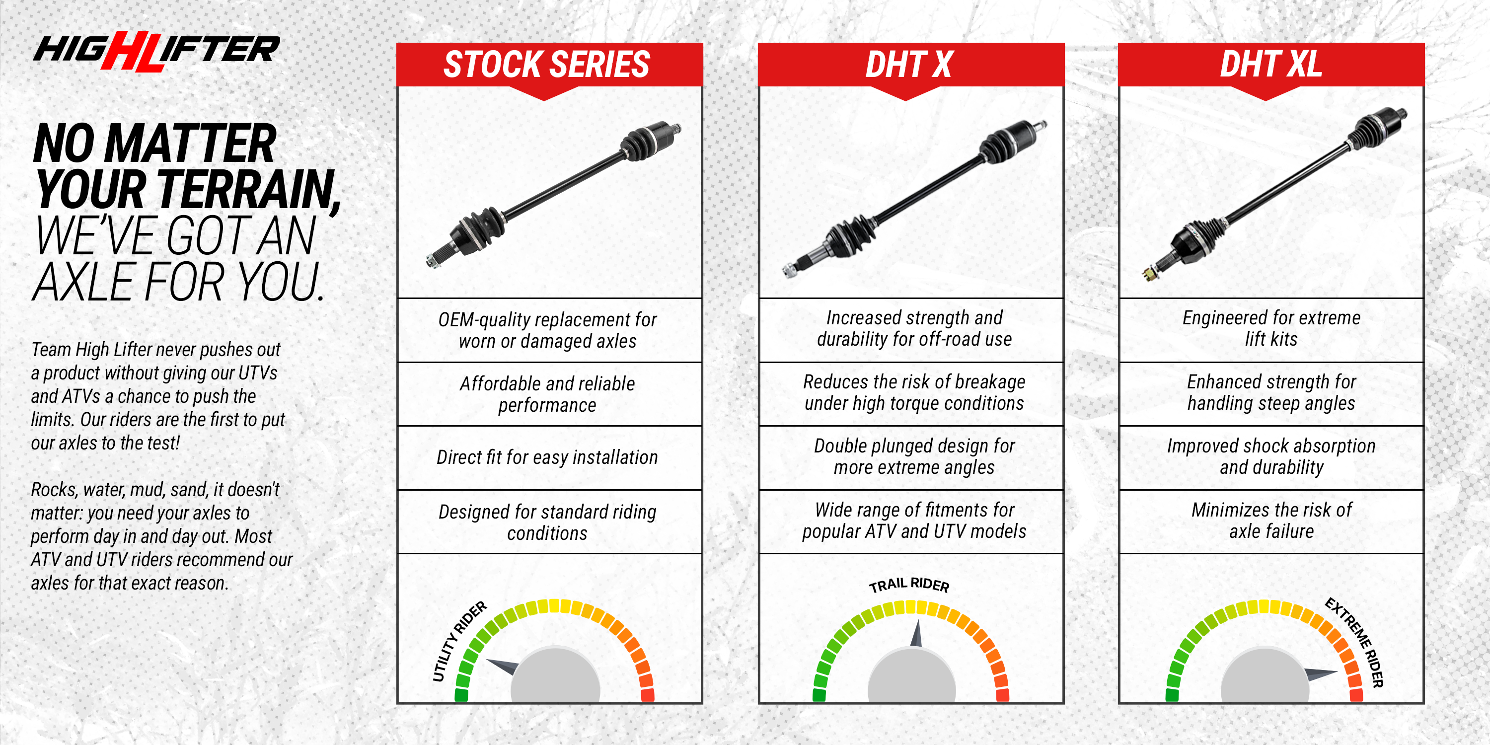 Whether you are out on the trails or on the job, breaking an axle will put an immediate damper on your day. High Lifter Stock Series Axles are OEM quality stock replacements that are a fraction of the cost. Manufactured with quality components and backed by High Lifter's 24-month warranty you can trust that your new axle was built to last.