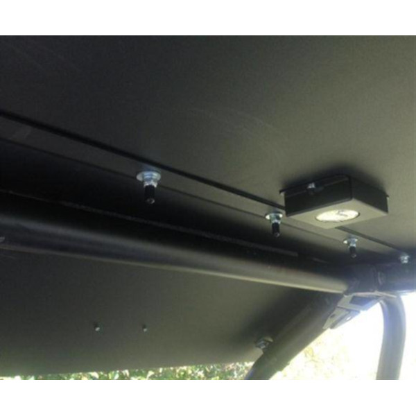 Protect yourself and your passenger from the rain, sleet, sun and snow with this stylish aluminum top. Fabricated from thick .100” 5052 Aircraft Grade Aluminum to ensure a rattle free ride. Included is a LED Dome light and aluminum housing that will light your cockpit for up to 100 hours on the supplied batteries. Attaches in minutes and bolts on with rubber coated straps. Supplied foam gaskets go between the top and your cage.