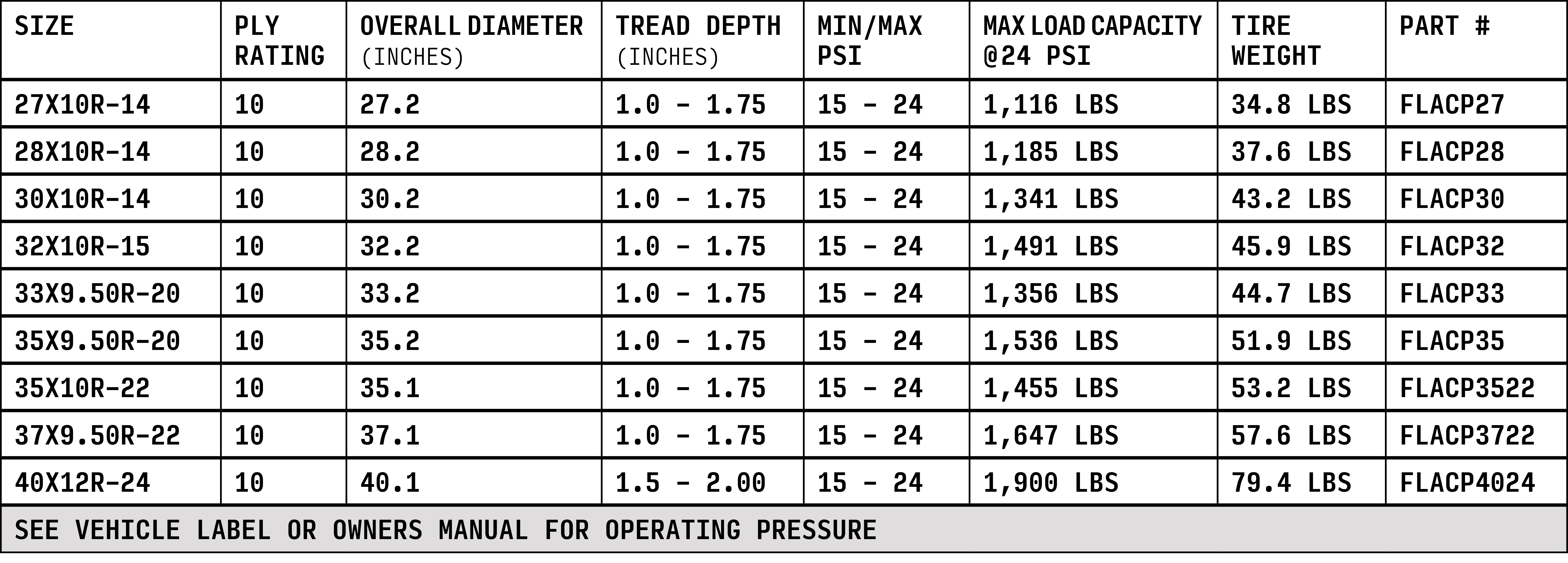 The 40” ACP tire features even deeper tread from 1.5 inches in the center to a massive 2 inch deep shoulder lug