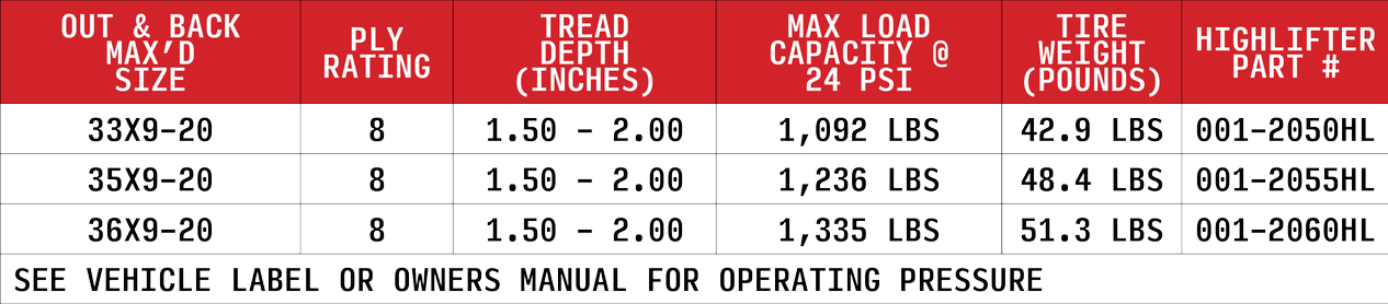 The Out&Back Max’d tire offers exceptional off-road performance without sacrificing too much of your ride quality. The super deep “V” style lugs are aggressive in the mud while still providing a smooth ride on hardpack. No matter where your adventures take you, you’ll always get where you’re going with a set of Out&Back Max’d tires from High Lifter.
