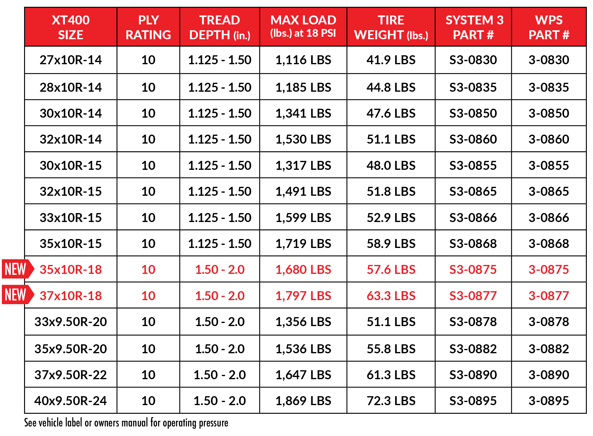 The System 3 XT400 is an extreme trail tire that was designed to tackle the most challenging off-road conditions. With sizes from 27-40 inches there is sure to be a size for any rider out there looking for extra performance.