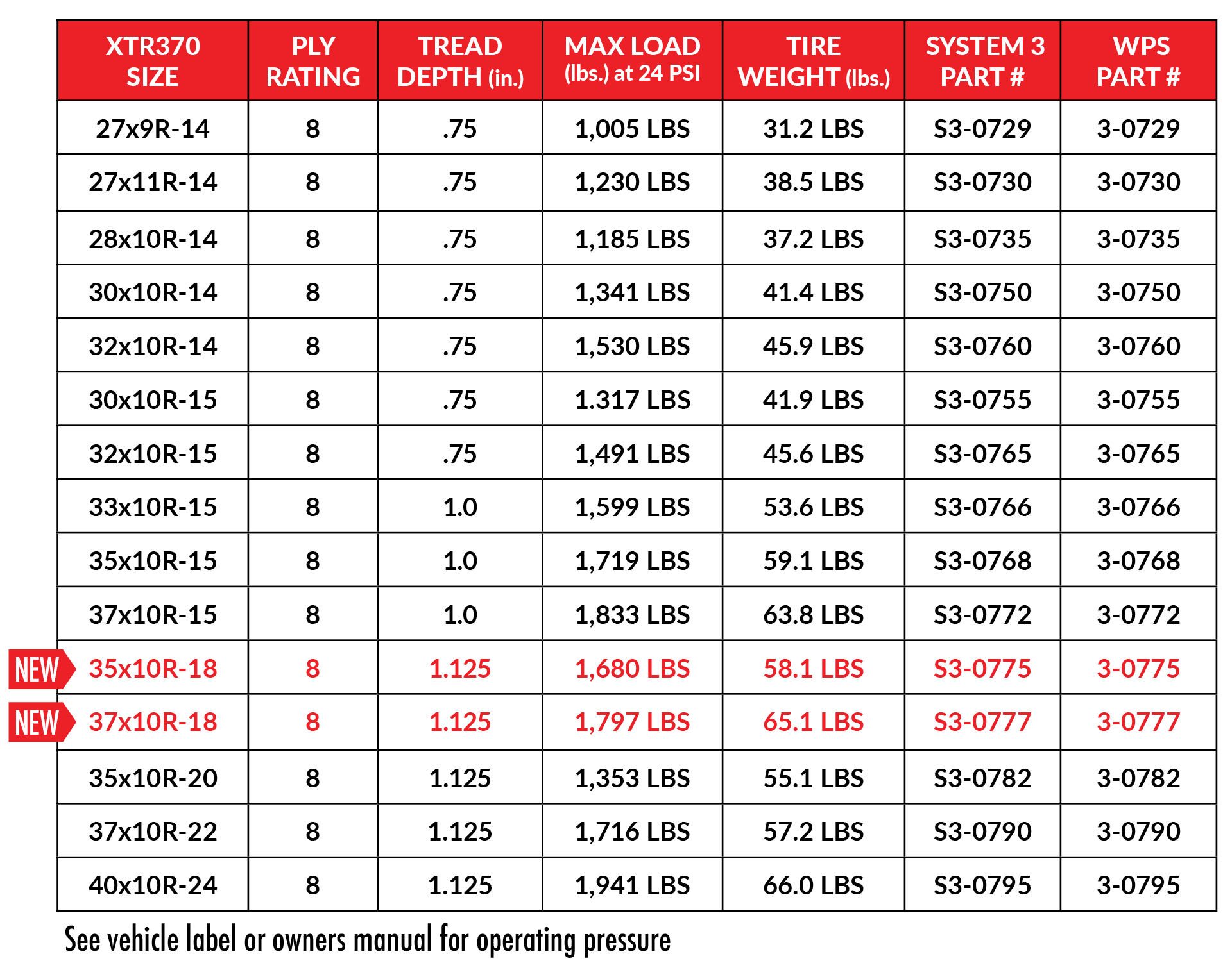 The System 3 XTR370 is a true cross-terrain radial tire built to conquer the toughest trails. Designed with trail riding in mind this tire features a robust radial construction and unique tread pattern to offer durability, traction, and ride quality.