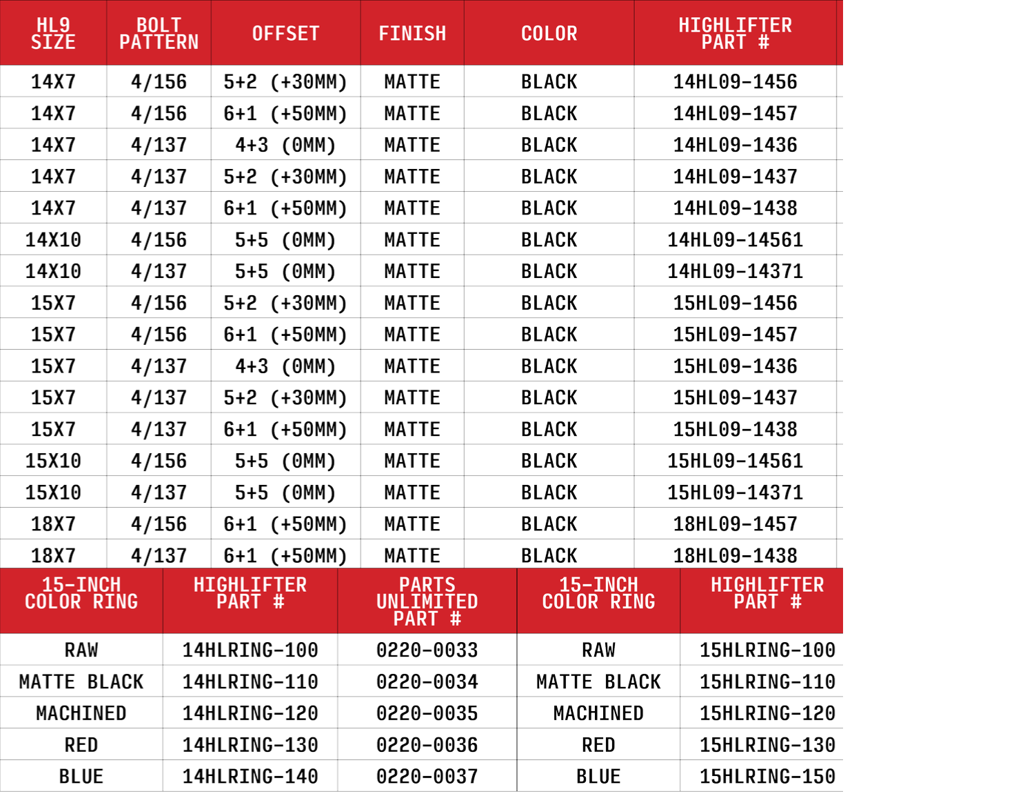 • Summary: The High Lifter HD9 Beadlock delivers Baja-proven performance in a classic 8-spoke design; its our strongest beadlock wheel line. The 10mm thick beadlock ring is secured by 5/16-inch grade-8 hardware for strength. The HD9 is available in 14-inch, 15-inch, and 18-inch sizes. You can buy optional machine-matching color beadlock rings for 14-inch and 15-inch wheels. This ultra-strong beadlock wheel is built for competition, whether youre racing Baja or just beating your buddy up the rocky climb.