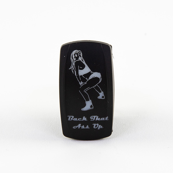 This special edition blue lighted "Back That Ass Up" switch is made as a custom replacement for the standard switch in the High Lifter Reverse Override Kit. It is illuminated to match the factory switches and mounts into factory locations in the dash console.