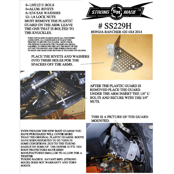 Stick stoppers help prevent one of the most common and costly atv repairs, broken axles. Most broken axles that we see are due to the cv boot being damaged which allows the grease to run out or lets sand and water into the joint which causes failure. Stick Stoppers are a simple concept, they bolt onto your factory A-Arms and provide protection where your bike needs it most. Note: These stick stoppers are intended to work on OEM arms with factory suspensions. In most cases a bracket lift will still work with these arms but may need minor trimming or modification of the stick stoppers to avoid clearance issues.