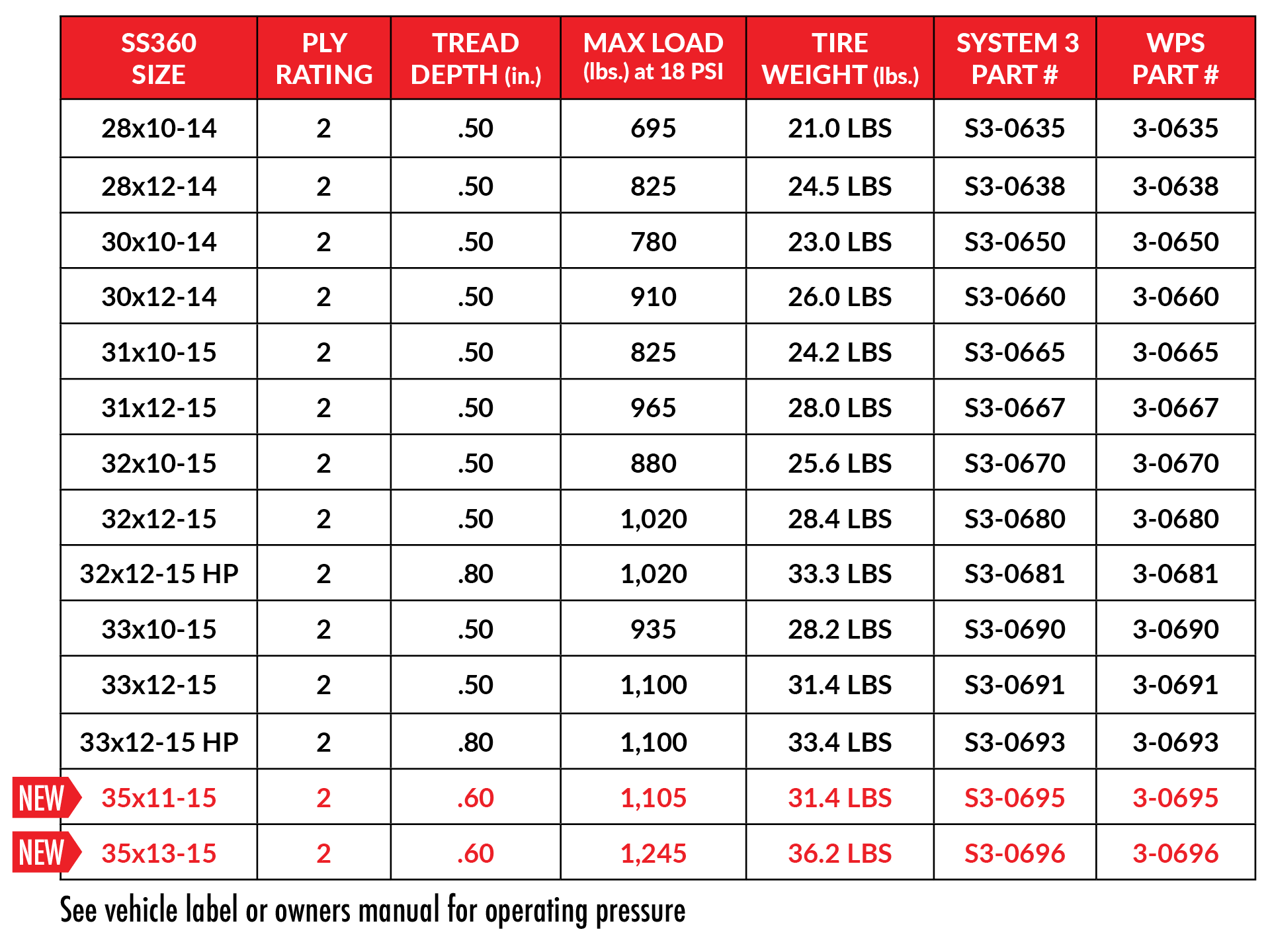 The System 3 SS360 tire offers the perfect balance cornering and forward traction needed to perform in the sand and snow. Super lightweight construction and low-rolling resistance reduce driveline stress and improve flotation.